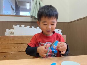 今日も子どもたちはちぎったり、つまんだり、ハサミを使ったりと活動する姿がみられました。