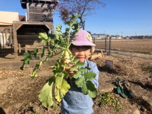 わくわく組で畑の野菜を収穫しに行きました!ほうれん草・かぶ・大根の3つの野菜を収穫しに行きました。