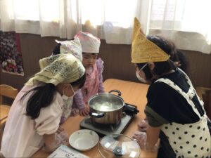 子どもたちは、「次は何するの?」と質問をしながら味噌汁作りを楽しんでいました。