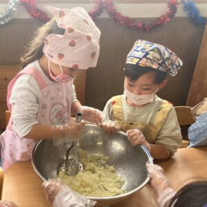 クリスマスを楽しもうと子ども達と一緒にじゃがいも使ったツリー型のポテトサラダを作りました。「どうやったらツリーになるかな」