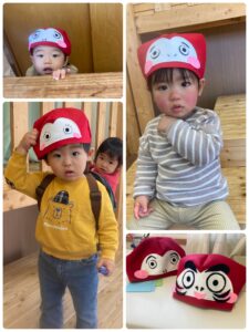1月の布制作は、だるまさんの帽子作りをしました❗️ お好みのお顔のだるまさんが完成して、早速かぶって見せてくれました🎵