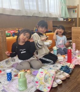 そして今日は月一回のお弁当の日でしたが、お部屋でピクニック気分を味わいました。