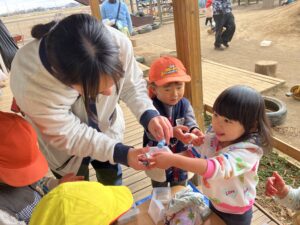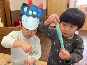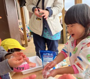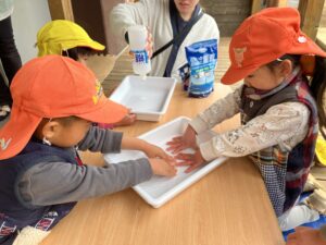 こねこねすると、だんだん固まってきて、「おもちみたい!」と驚く子どもたち。