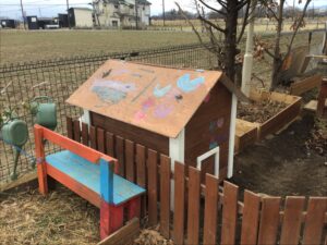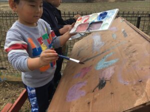 「家を可愛くしたい!」「絵を描きたい!」という子どもたちの発案で、わくわく組の子どもたちで、ビオトープに出来た「水のタンクが入っている家」に絵を描きました。