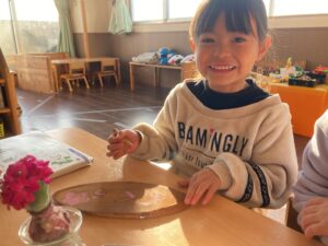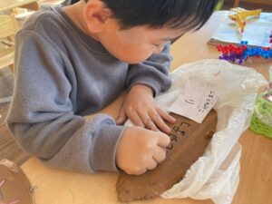 園庭の木に名札がなかったので、わくわく組で名札作りをしました。