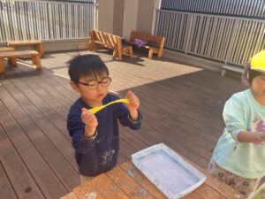 はじめてスライム作りに挑戦しました!最初は柔らかい状態から固まらず… わくわく組の子どもと保育者で一緒に、捏ねたり、混ぜたり色々試してみました。