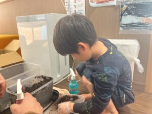虫かごの土に水をあげ、土を混ぜていました。