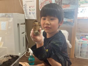 保育者がヘラクレスの幼虫をわくわく組のお部屋に持っていくと、