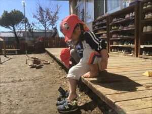 1歳児クラスの子どもも3月になると自分で靴を履くことが出来るようになり、帽子を被って自分で支度していきます。
