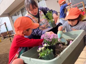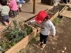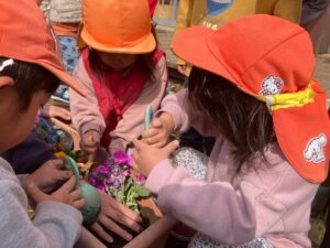 先生に「おはなは そっと持ってね」と教えてもらった2歳児さん