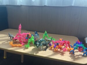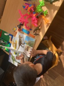 隣には恐竜の図鑑を置いて、好きな恐竜をブロックで細かく再現しようと工夫する姿が見られていました。