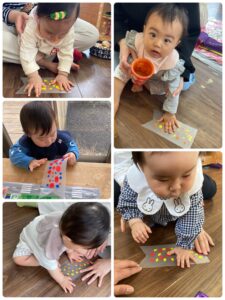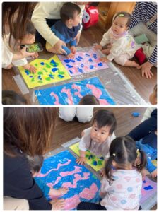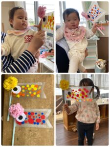 みんなで絵の具の感触を楽しんだり、ひとりひとりペタペタして鯉のぼりに仕上げてもらいました❗️
