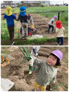 隣の畑で育てていた玉ねぎが大きくなったので、年長さんと収穫しました。