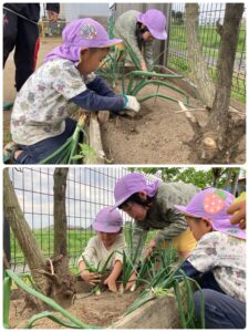 月初の時よりもずっと大きくなっていて、みんなで驚きましたが、もう少し大きくなりそうなので、園庭の土に植えてみました🧅