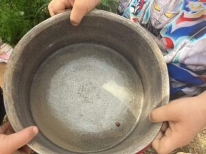 後からやってきた四歳児の男の子が鍋の玩具を持ってきてそこにてんとう虫を入れてくれました。