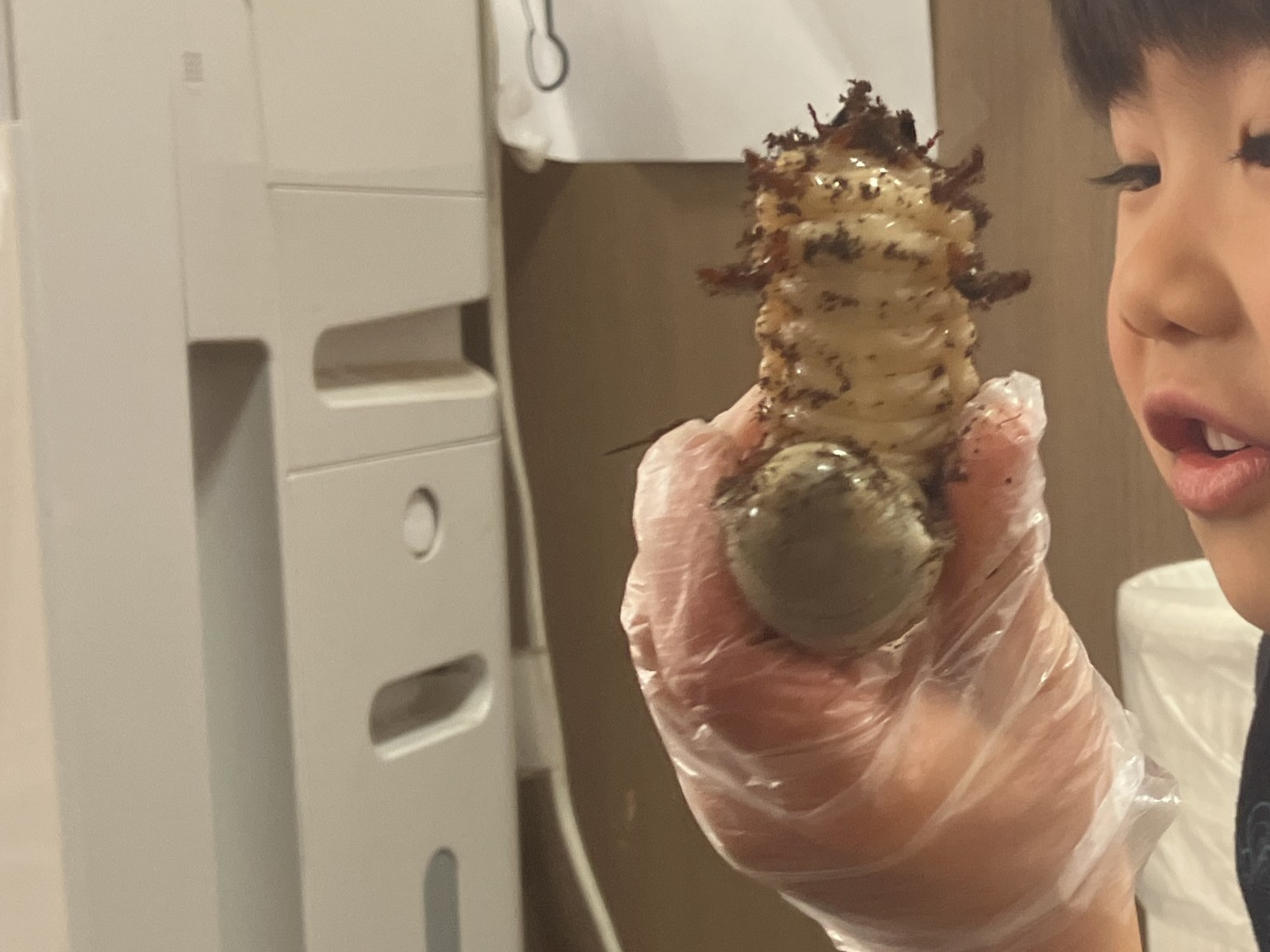 保育者がヘラクレスの幼虫をわくわく組のお部屋に持っていくと、 「あ!ヘラクレスの幼虫!」「見たい!」とわくわくな子どもたち。 虫かご…