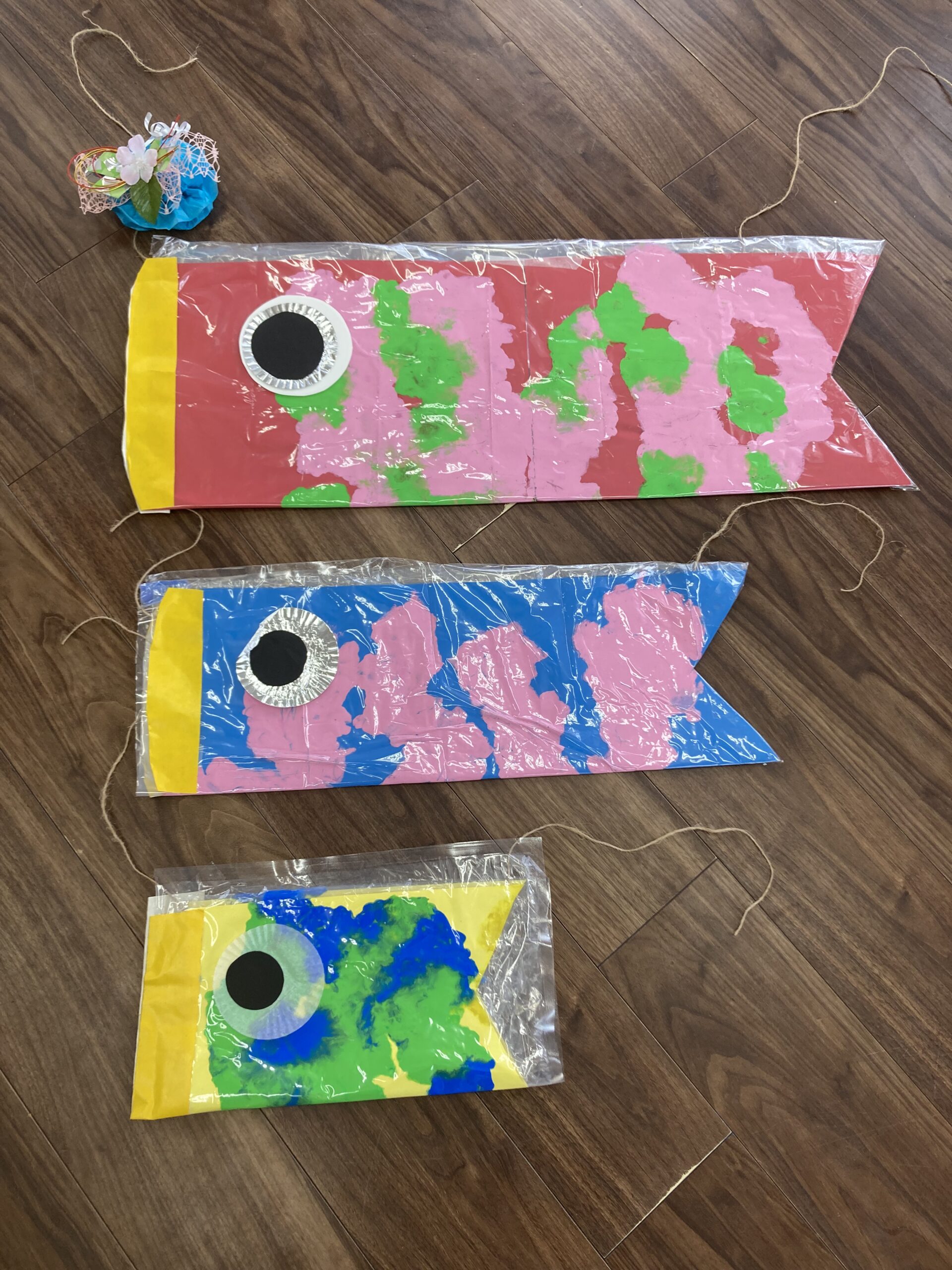 今月のファーストアートは、大きな鯉のぼりと小さな鯉のぼりと作りました🎏 みんなで絵の具の感触を楽しんだり、ひとりひとりペタペタして鯉…