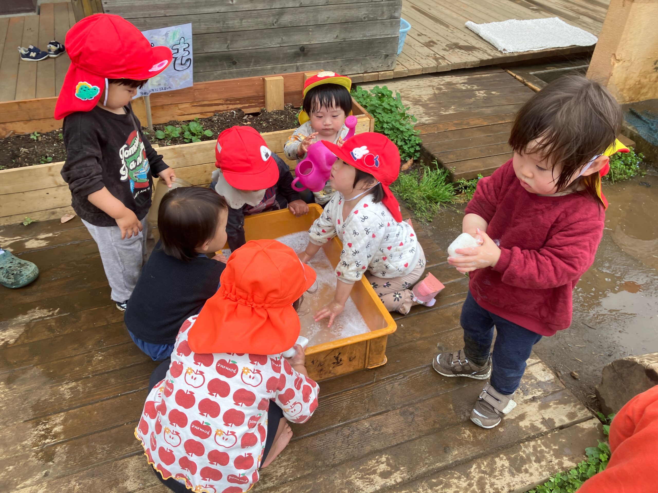 時々雨が降る今日のお天気。“お外遊びは難しいかな…”と思いましたが、雨が止むと、子ども達は全く気にせず泡遊びに集中していました。 前…