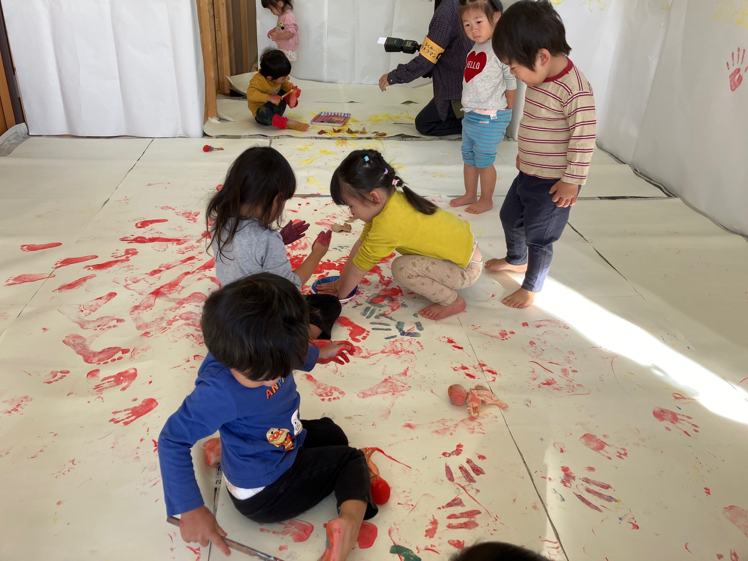今日は、にこにこ組と月グループで、フィンガーペインティングをしました。 お部屋全体に紙を貼り、準備万端! 子どもたちはその様子を見て…