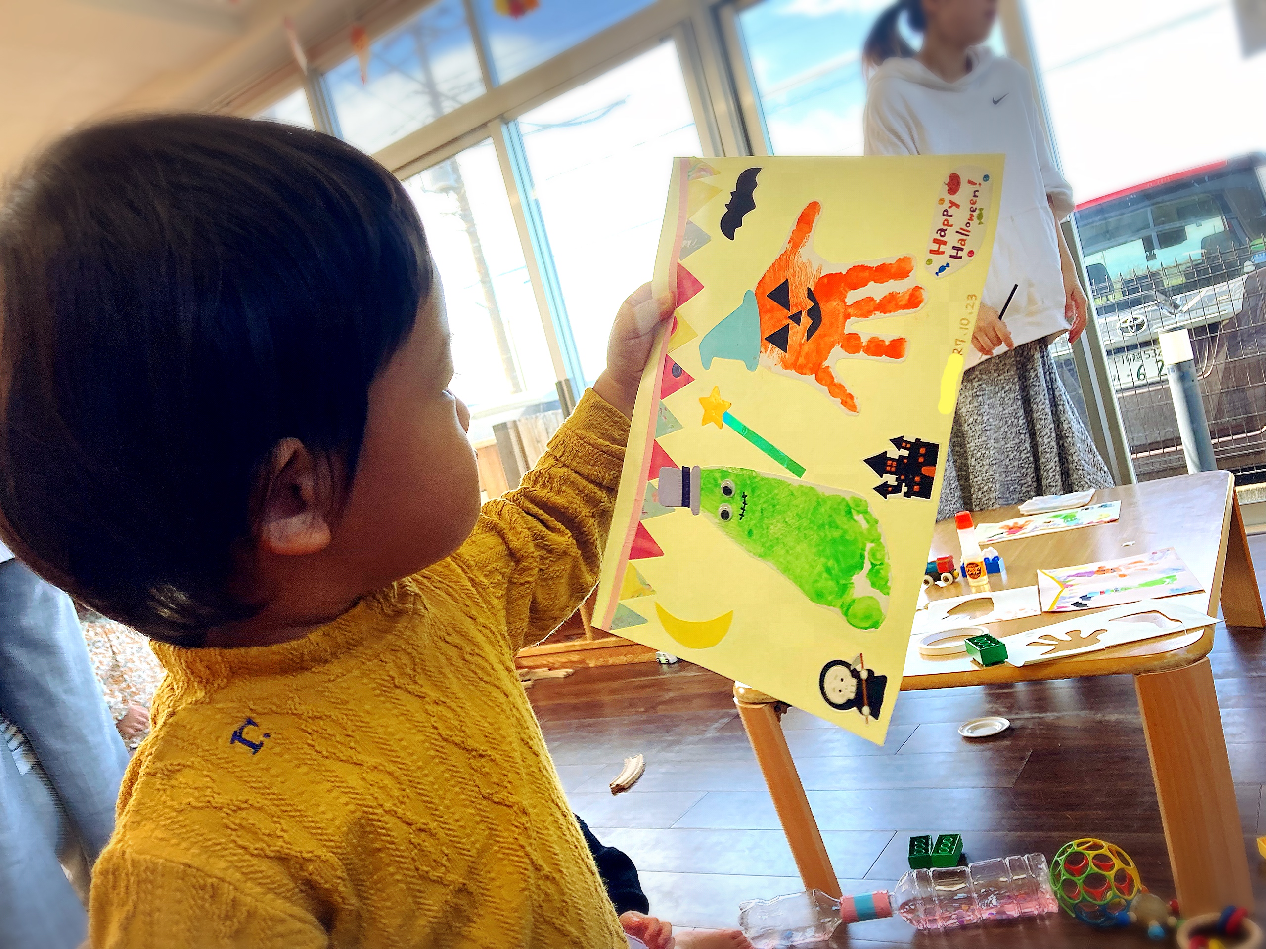 今月のファーストアートはハロウィンカラーで行いました❗️ 袋の上から触って、だんだんお化けらしくなりました🎃 ひとりずつかぼちゃのお…