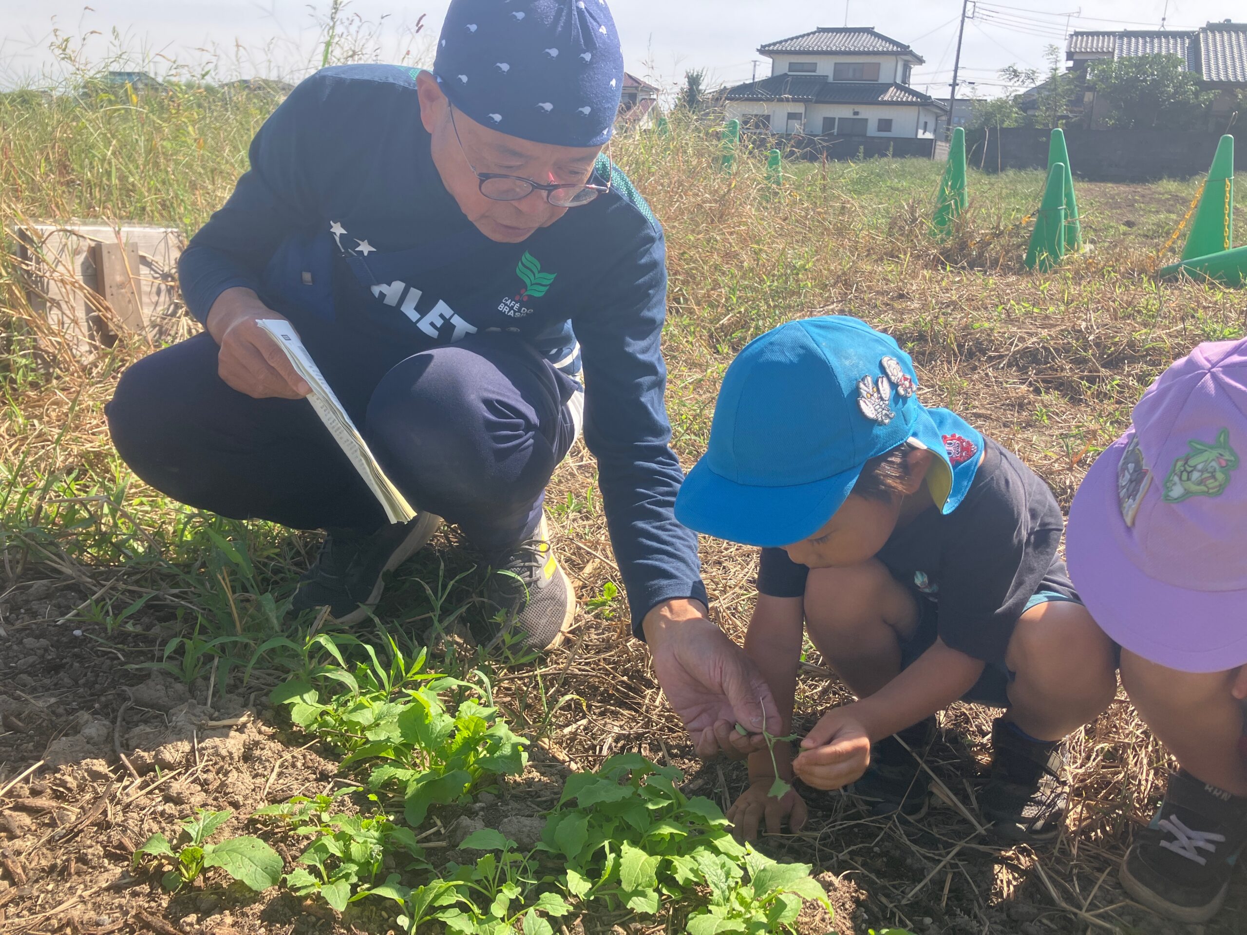 保育園の隣の畑では 春に植えたサツマイモがまだかまだかと土の中で待っています。 その隣では、先日のお買い物で買ってきて植えたカブと大…