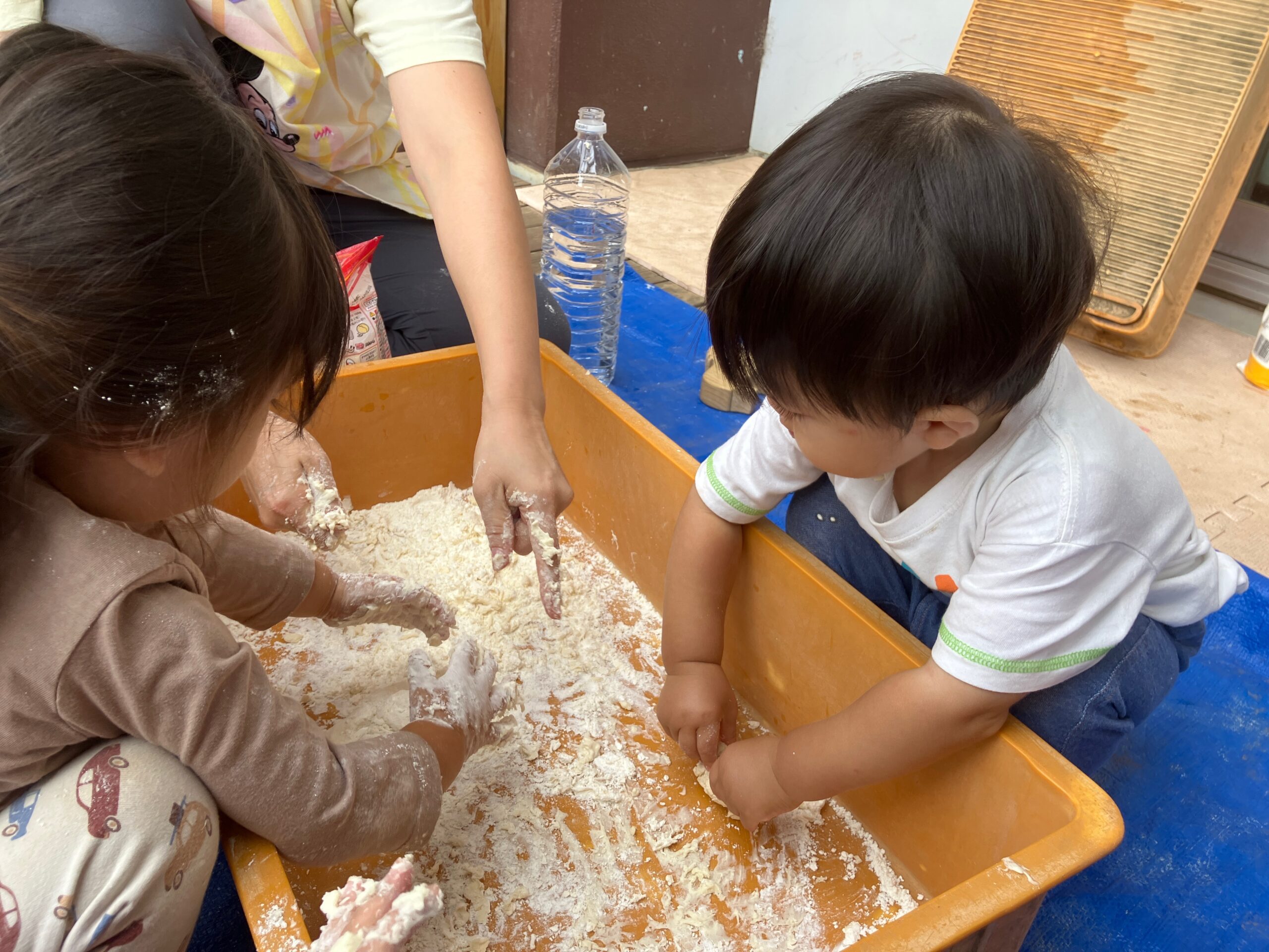 1,2歳児さんを中心に小麦粉粘土をしました。 最初はさらさらな感触だった小麦粉。 水を入れると、、ねばねばになり、ぎゅっぎゅ…