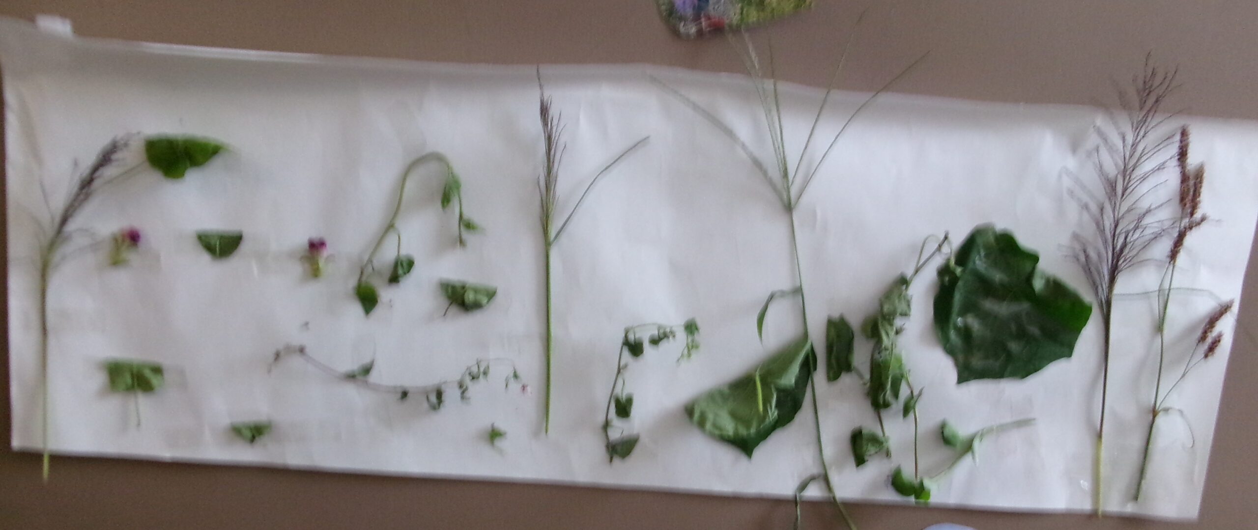 「この葉っぱ蝶々の形をしているよ」 摘んだ葉っぱの形がちょうちょの形みたいと気づき教えてくれました。 摘んできた葉っぱと花を紙に置い…