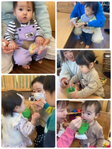 さつまいもや人参を潰してもらい、味噌味のの温かい豆乳スープと混ぜて試食しました。