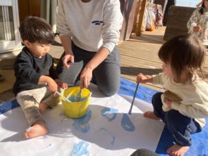 今日はテラスで絵の具遊びをしました。